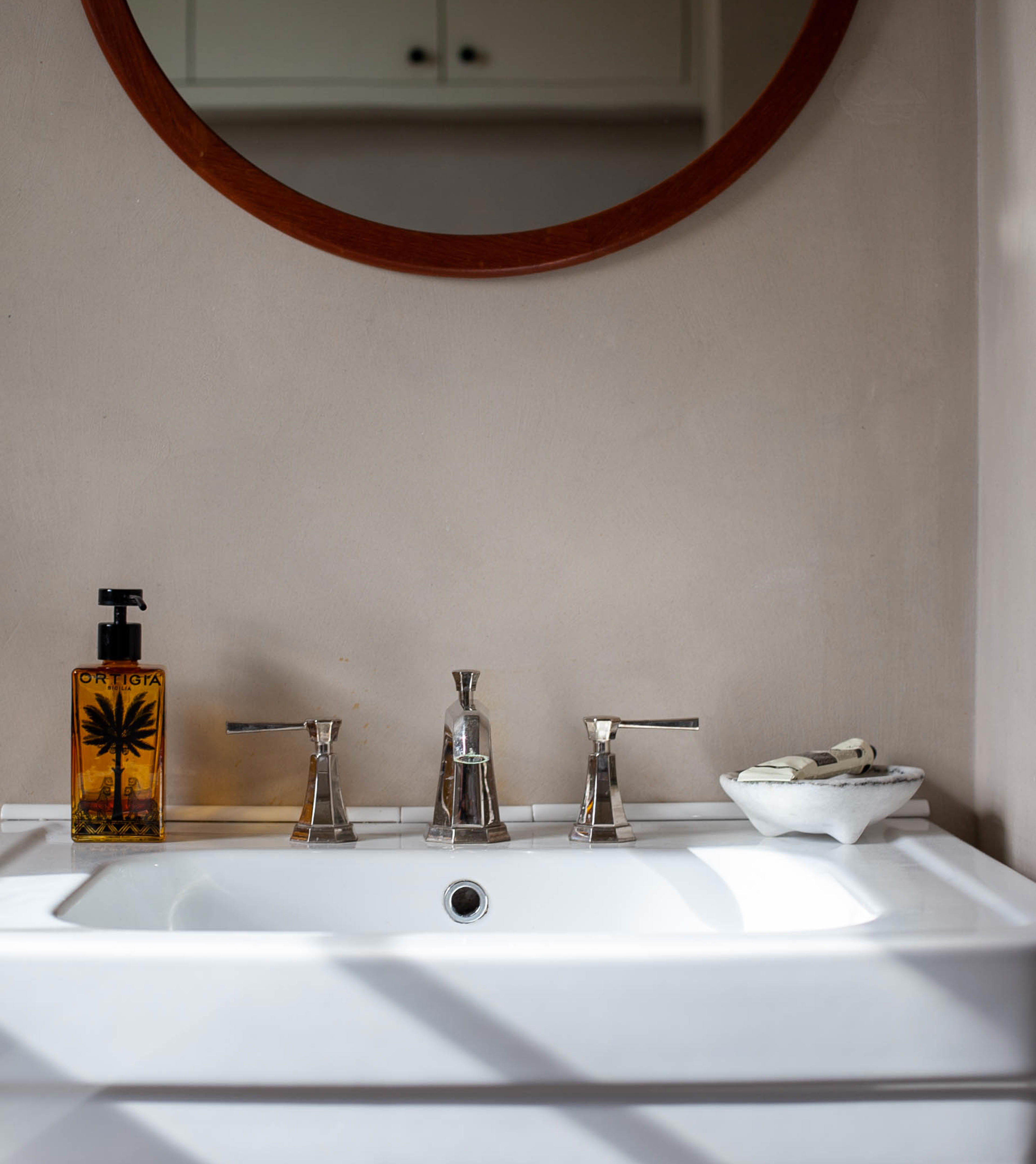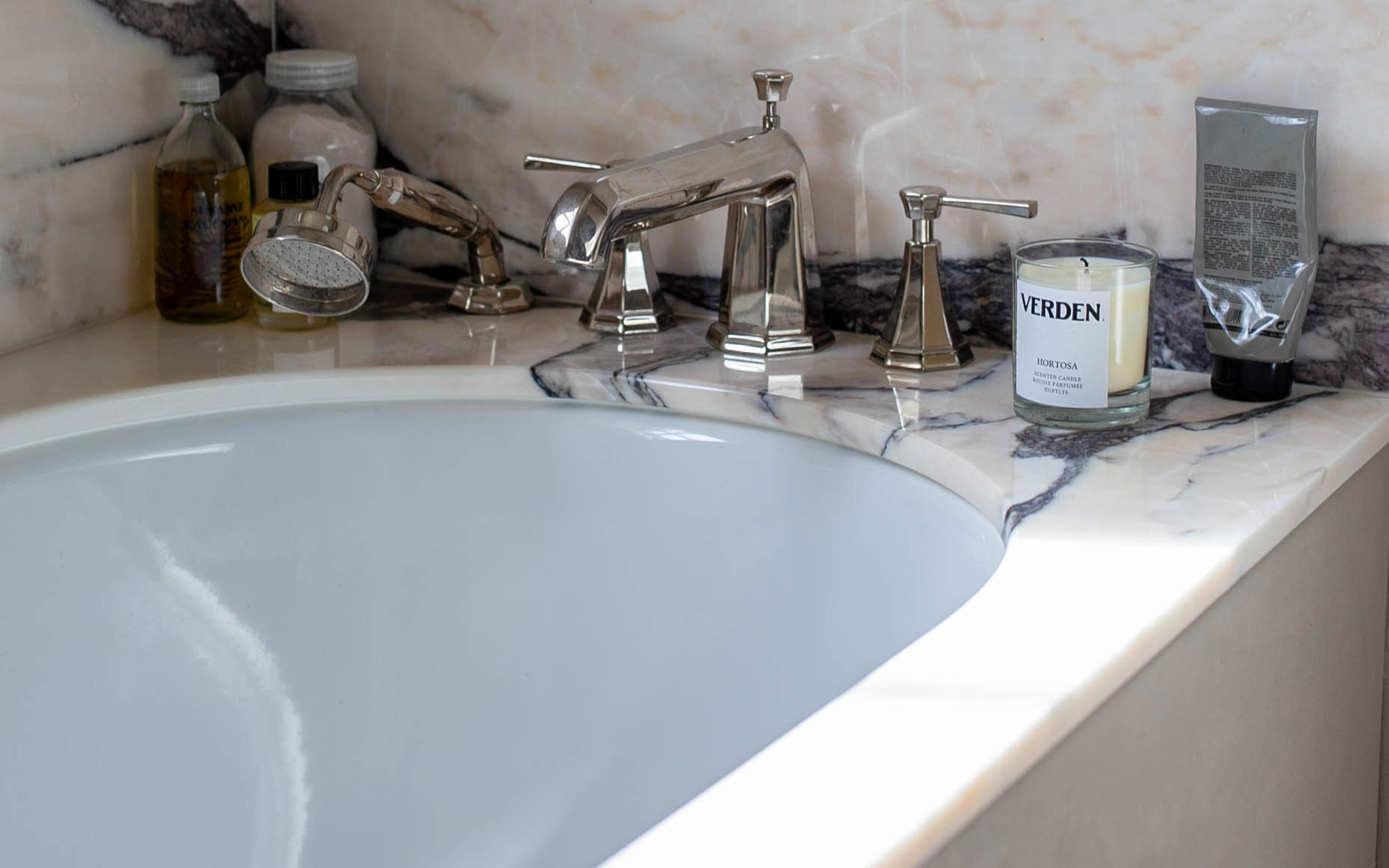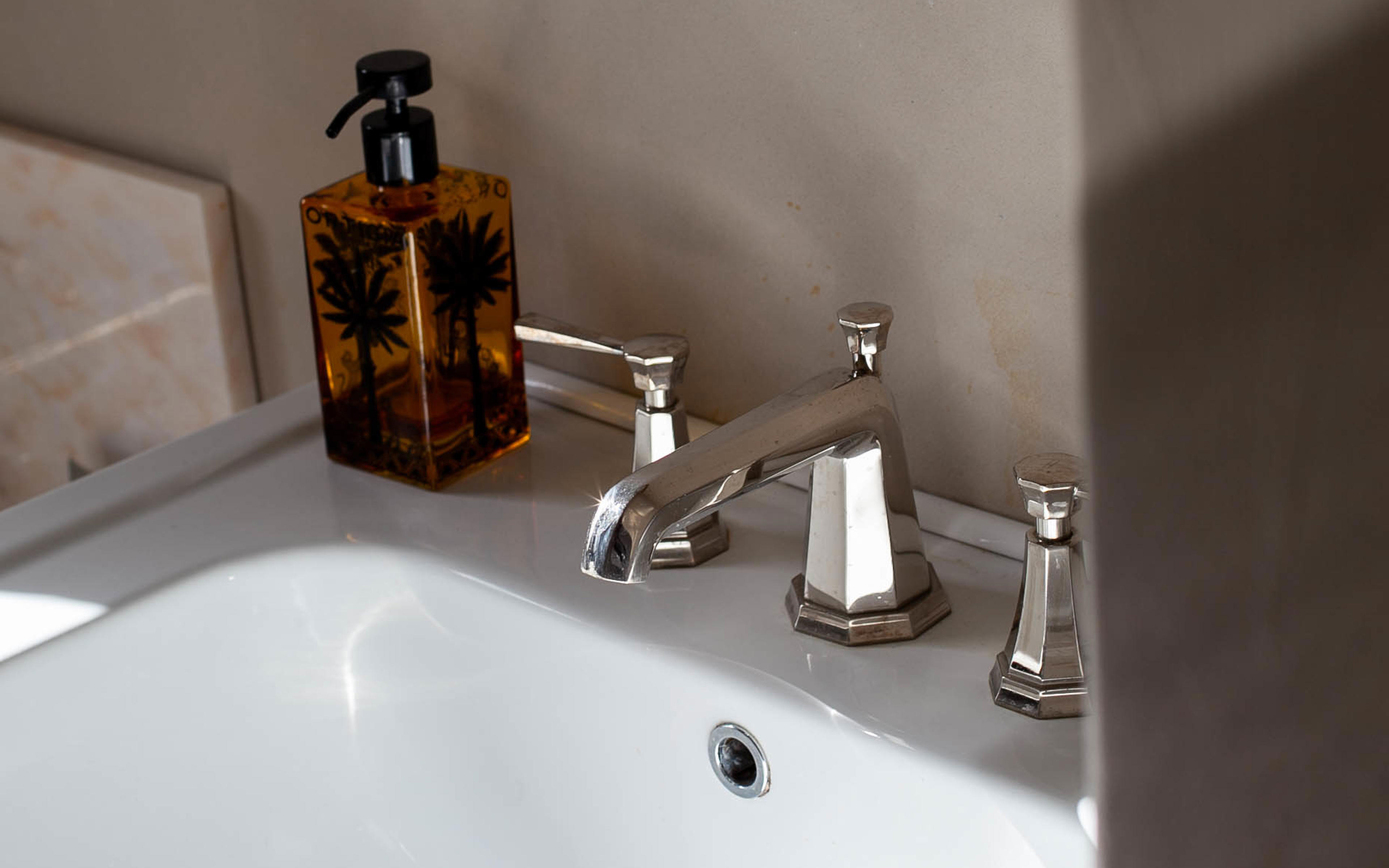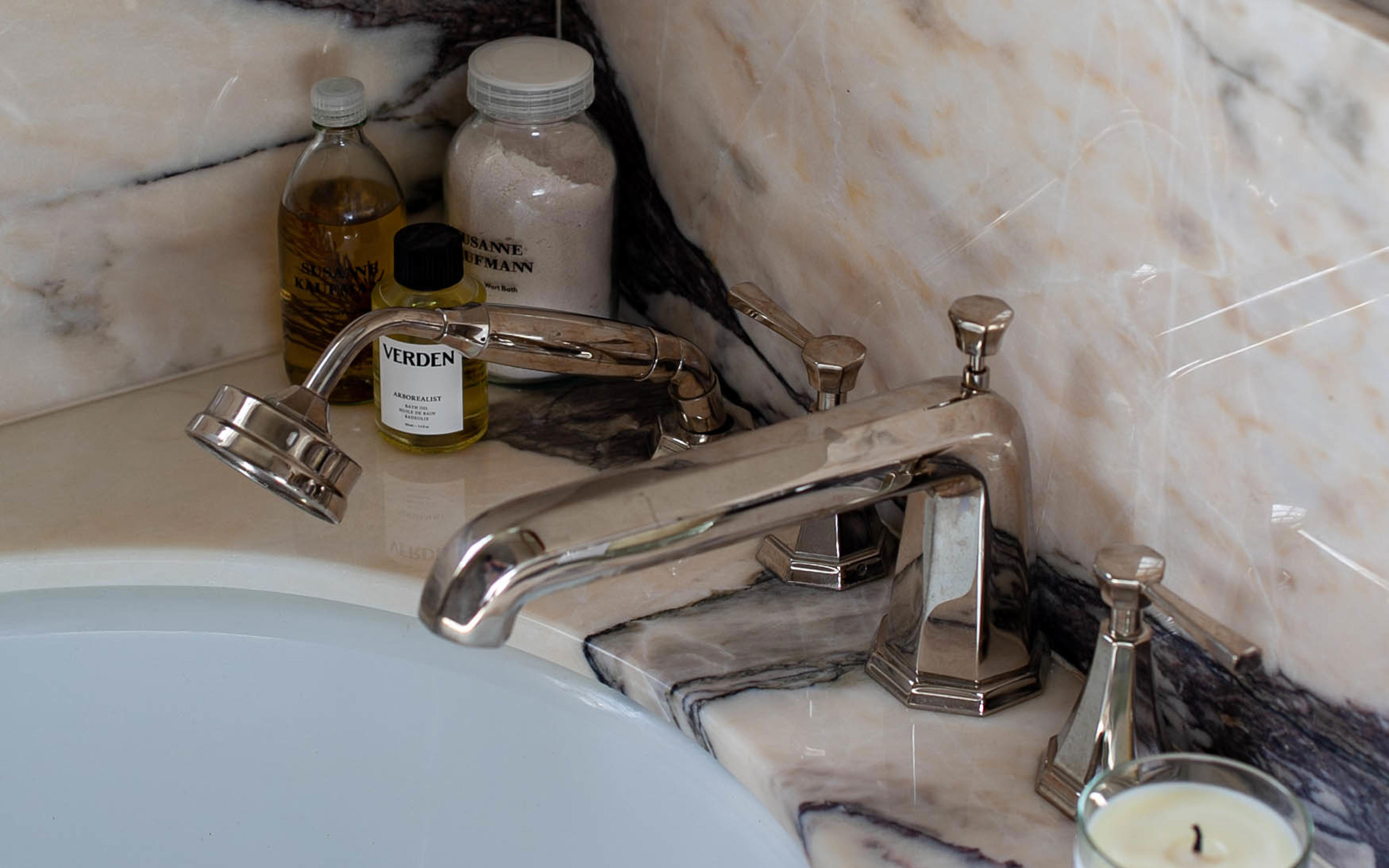 Journalist and podcast host Anna Barnett opted for basin taps, a deck-mounted bath mixer and a concealed shower set from the Perrin & Rowe Deco collection for the bathrooms in her East London period home.