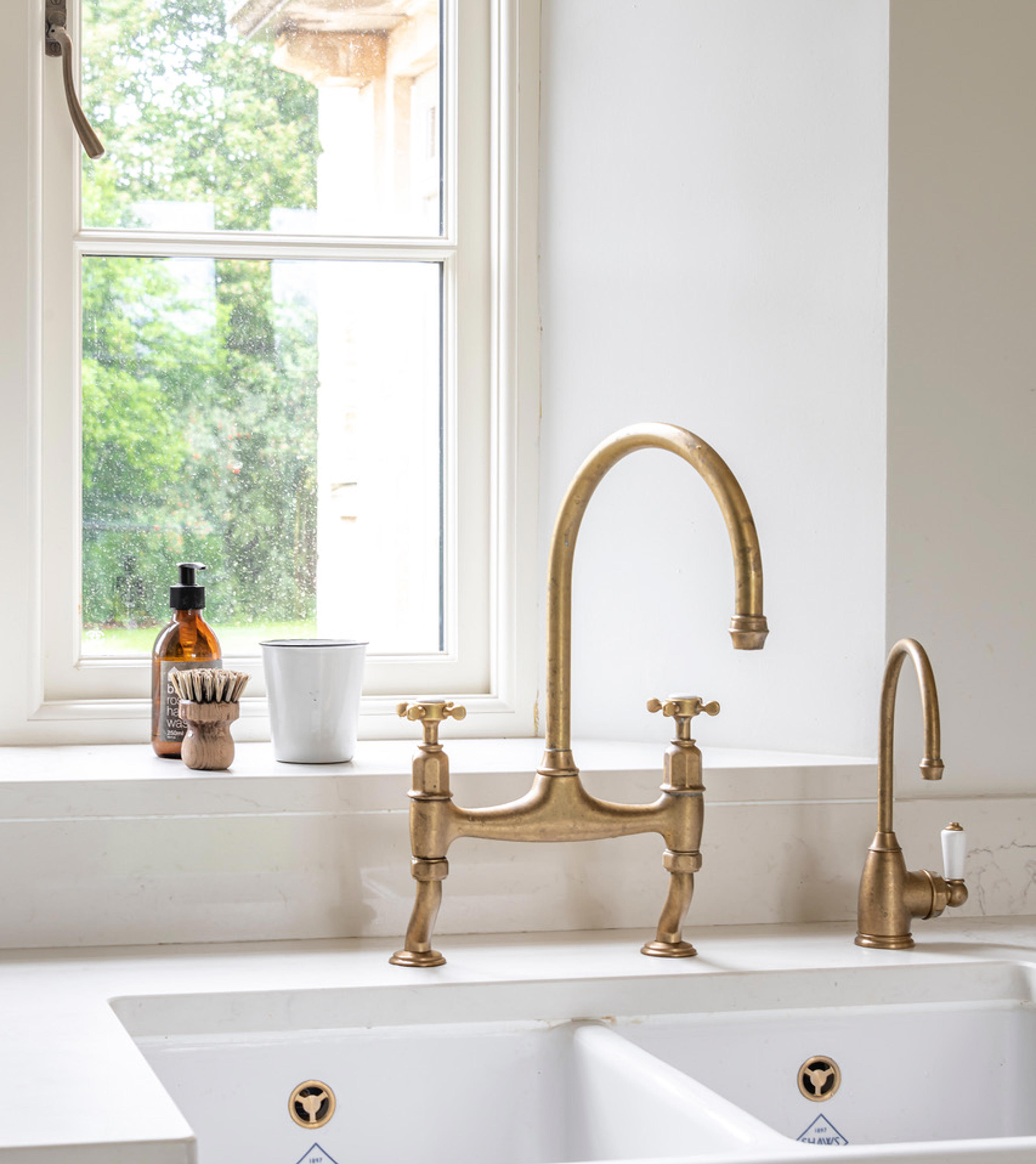On the central island is a Shaws Inset 800 sink with a satin brass Ionian bridge mixer and rinse from Perrin & Rowe.