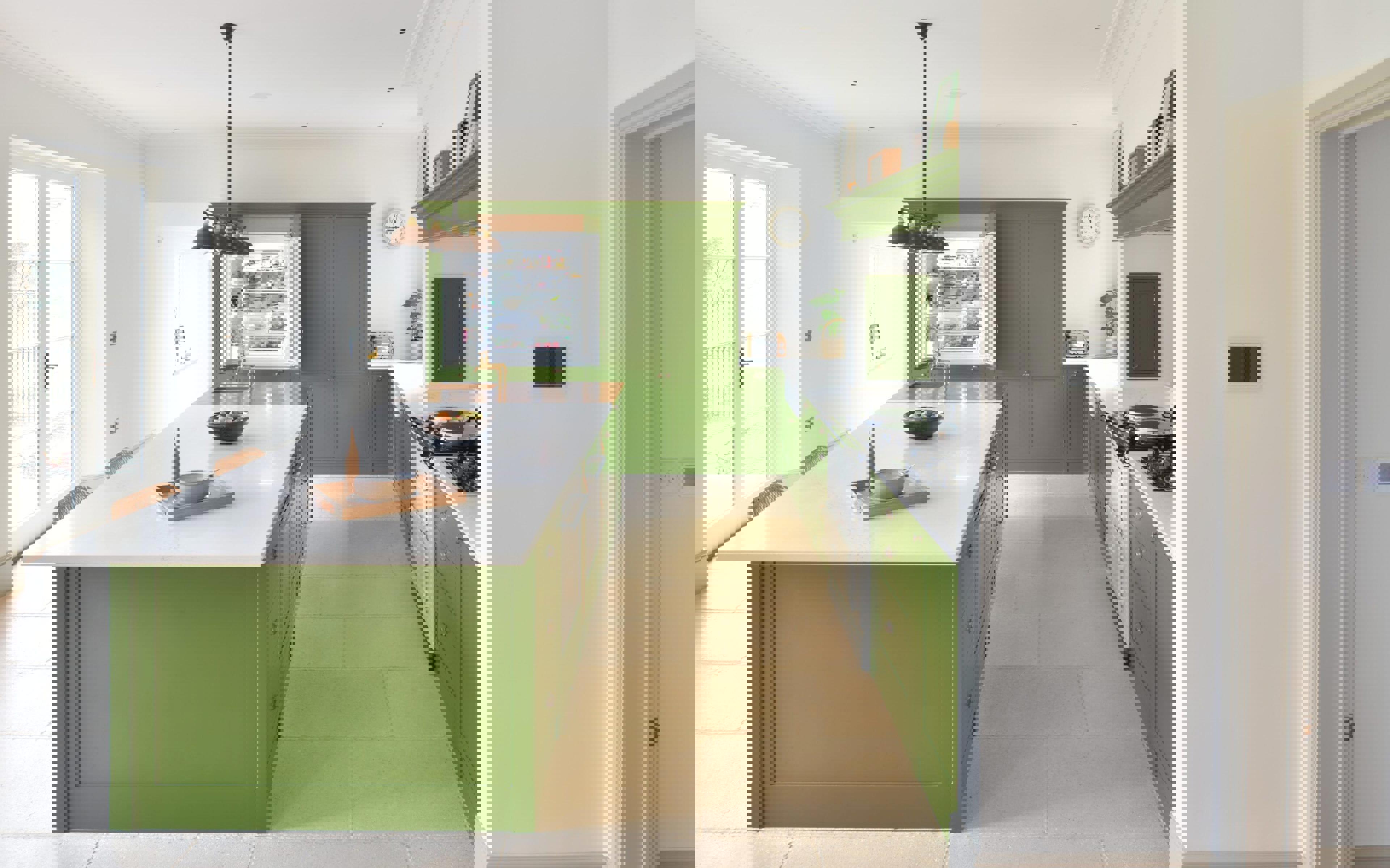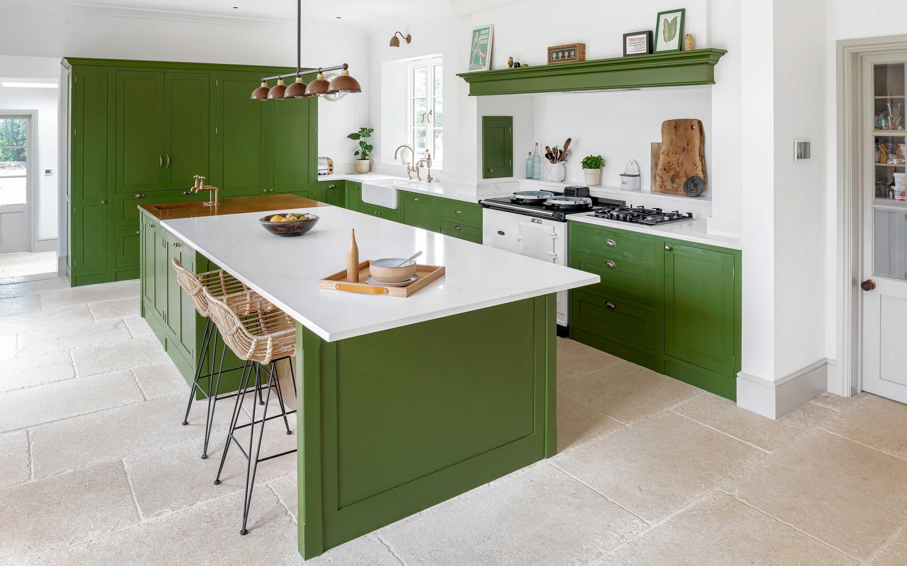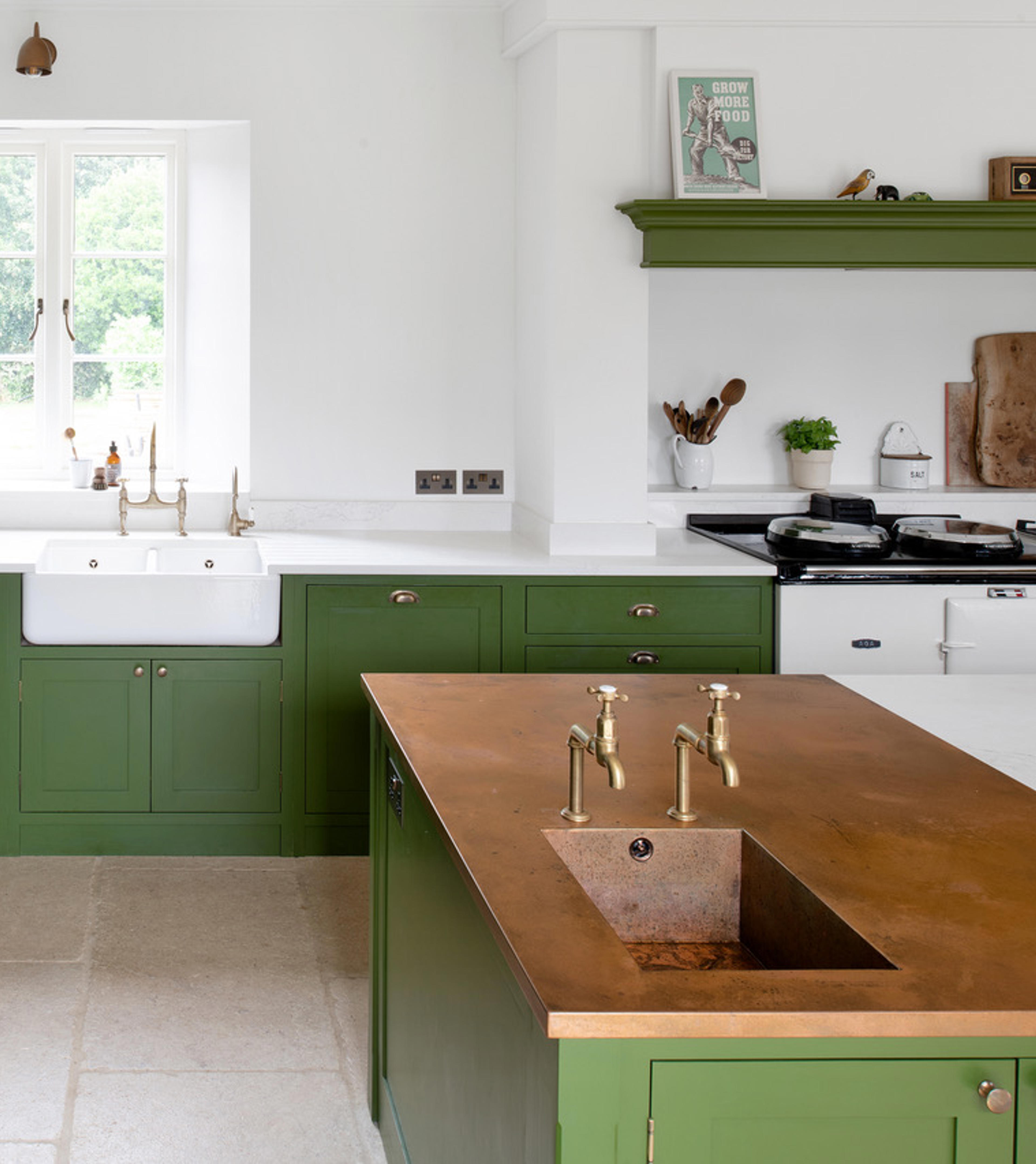 The space also features two oven Aga range cookers, in white vitreous enamel. The bold use of white is a feature throughout the space that keeps everything light and airy. The whitewashed walls, so reminiscent of a country kitchen, and the clean white granite work surfaces bounce light around the room, allowing the green and copper to dominate without being too dark and oppressive. This kitchen has been designed from the ground up, so the whole kitchen sits on a floor of traditional flagstones by Beswick Stone. It had to be stone, after all; this is the Cotswolds.