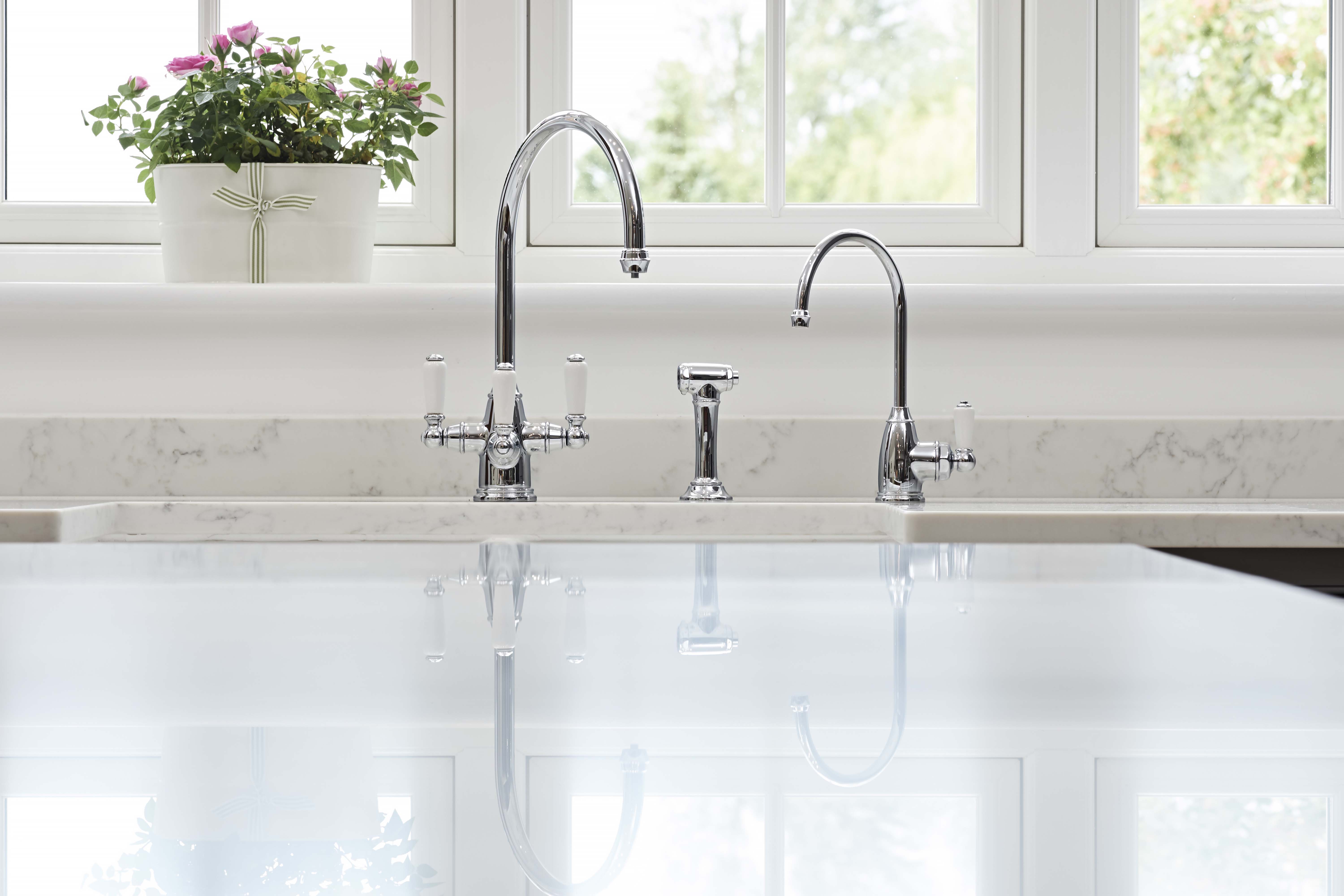 Precioso estilo clásico sin renunciar a la tecnología: nuestro mezclador de fregadero Phoenician dispensa agua potable caliente, fría y filtrada, además de contar con un práctico rociador lateral. Este modelo cuenta con tres manetas. También disponible con dos manetas.