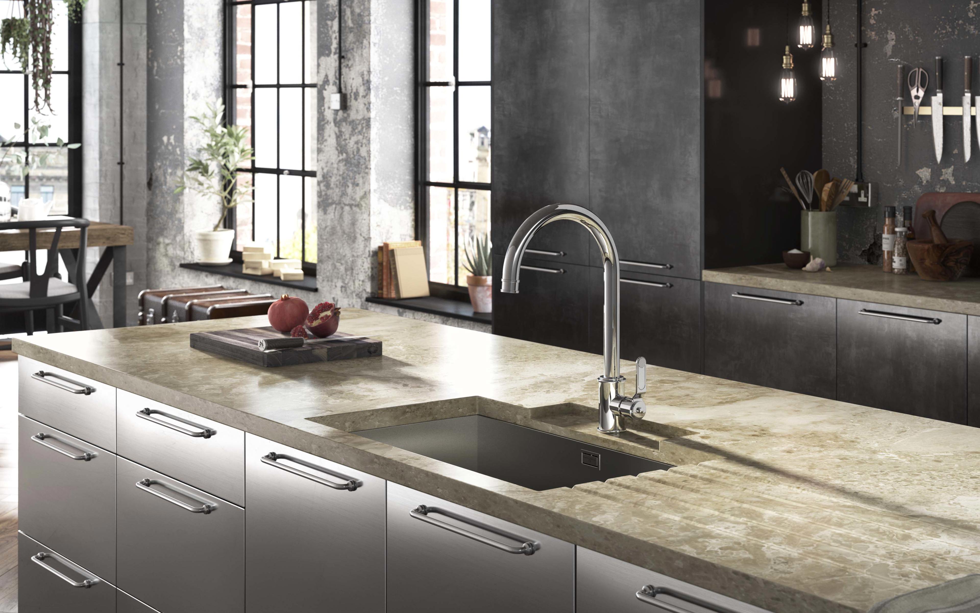 Version étonnamment moderne héritée de la robinetterie ménagère, Armstrong combine une esthétique industrielle avec le sens de l’équilibre et de la proportion d’un designer. Il s’agit de la version Perrin & Rowe du mitigeur à pont classique de cuisine.
