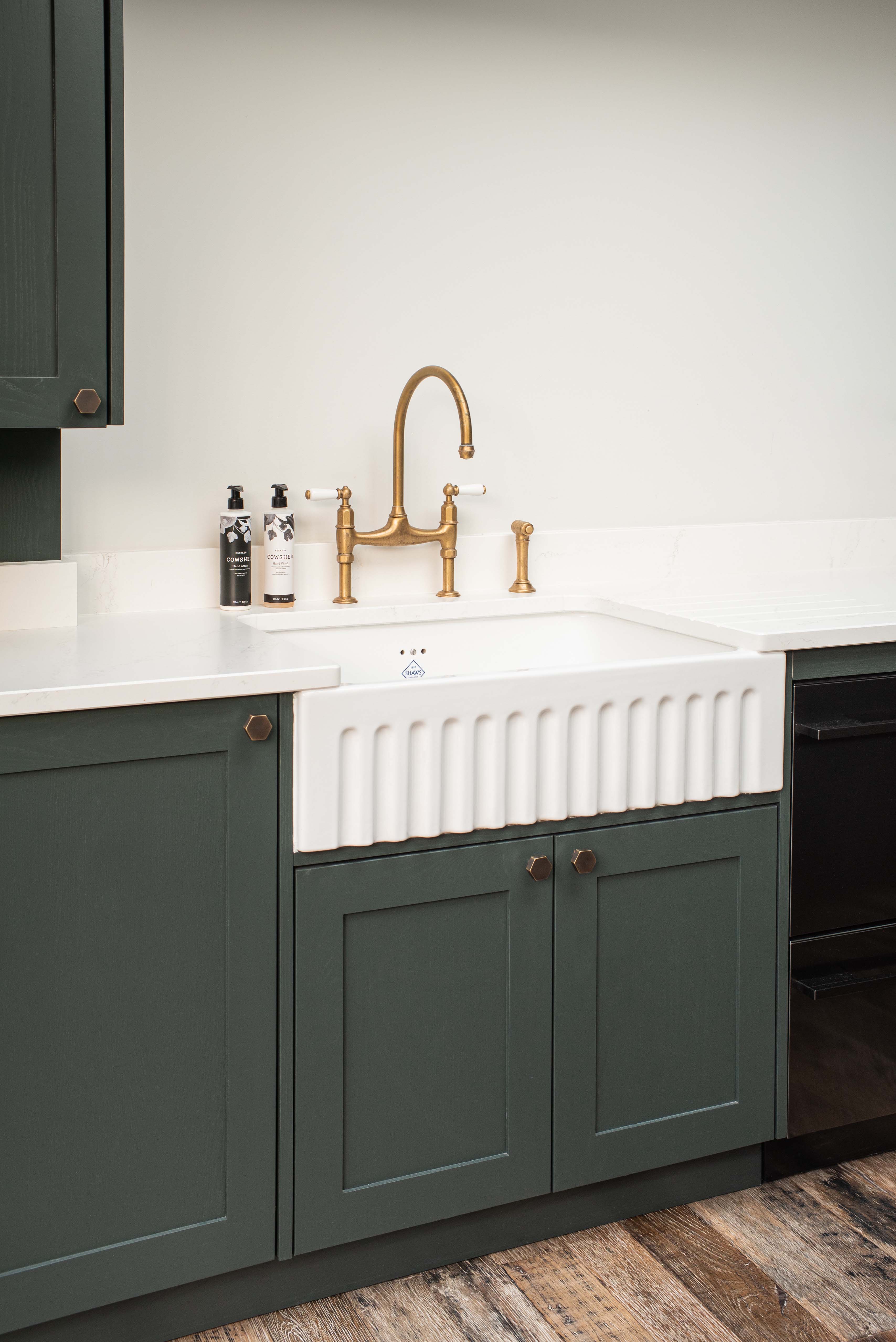 L'évier Bowland 800 à façade cannelée est placé le plus à gauche possible sur le plan de travail, à côté du mitigeur Perrin & Rowe Ionian bridge avec un jet de rinçage latéral - une autre exigence de Penny.Le robinet et le rince-bouche sont en finition laiton satiné, qui s'harmonise parfaitement avec les meubles de cuisine vert foncé.Penny souhaitait disposer d'un plan de travail aussi long que possible et ne voulait pas qu'il soit interrompu par un évier au milieu. L'évier secondaire est un Shaws Round, l'un des plus petits éviers de Shaws, ce qui en fait une option parfaite.Dans ce cas, il était idéal de l'associer à un robinet d'eau chaude instantanée.