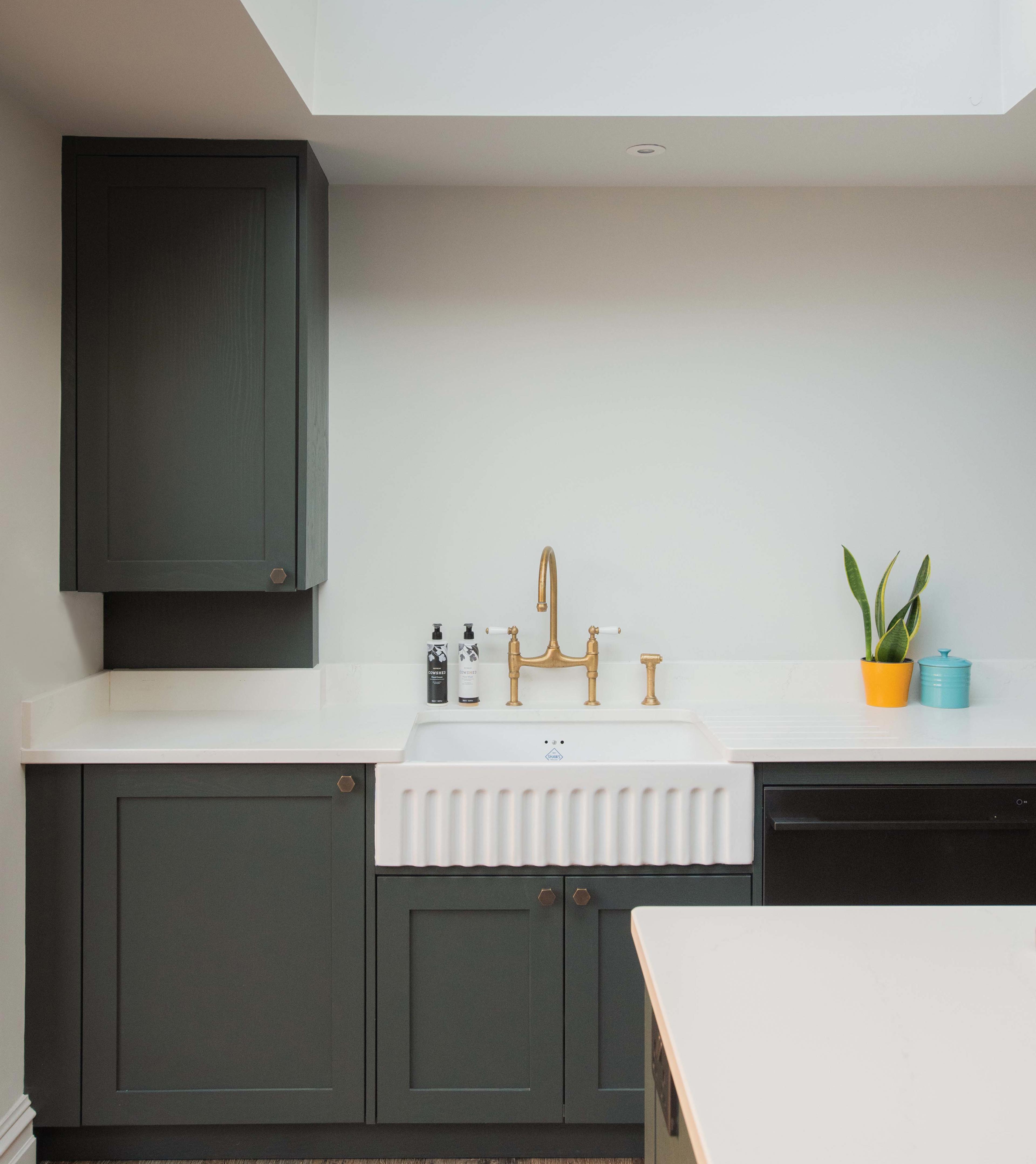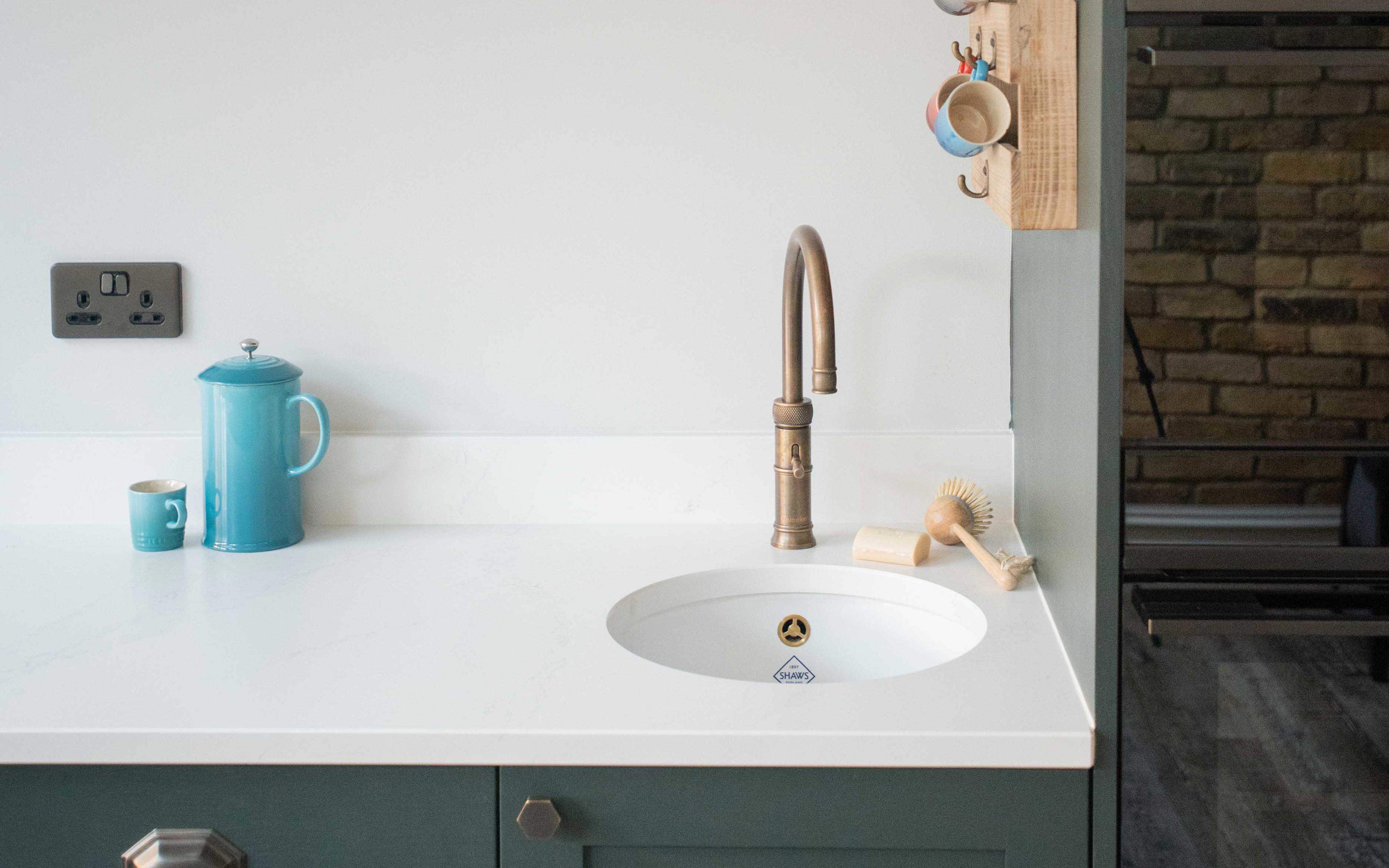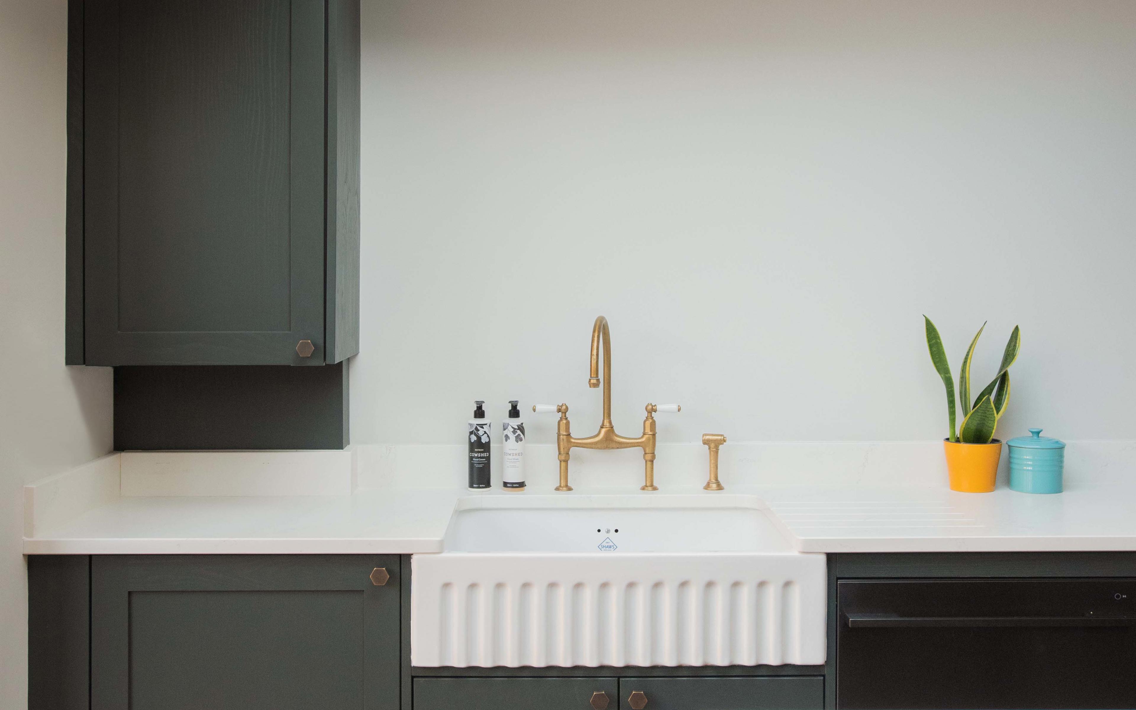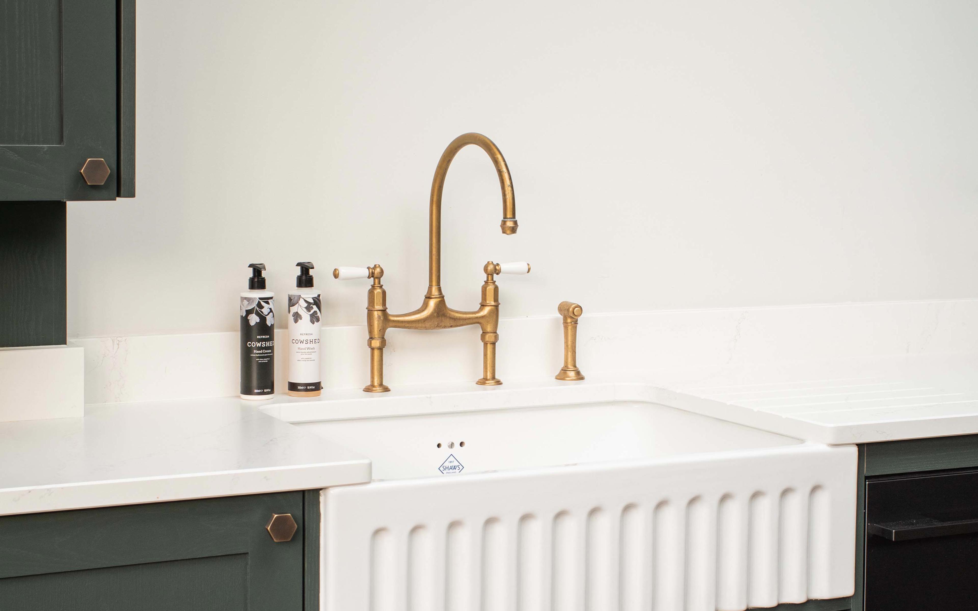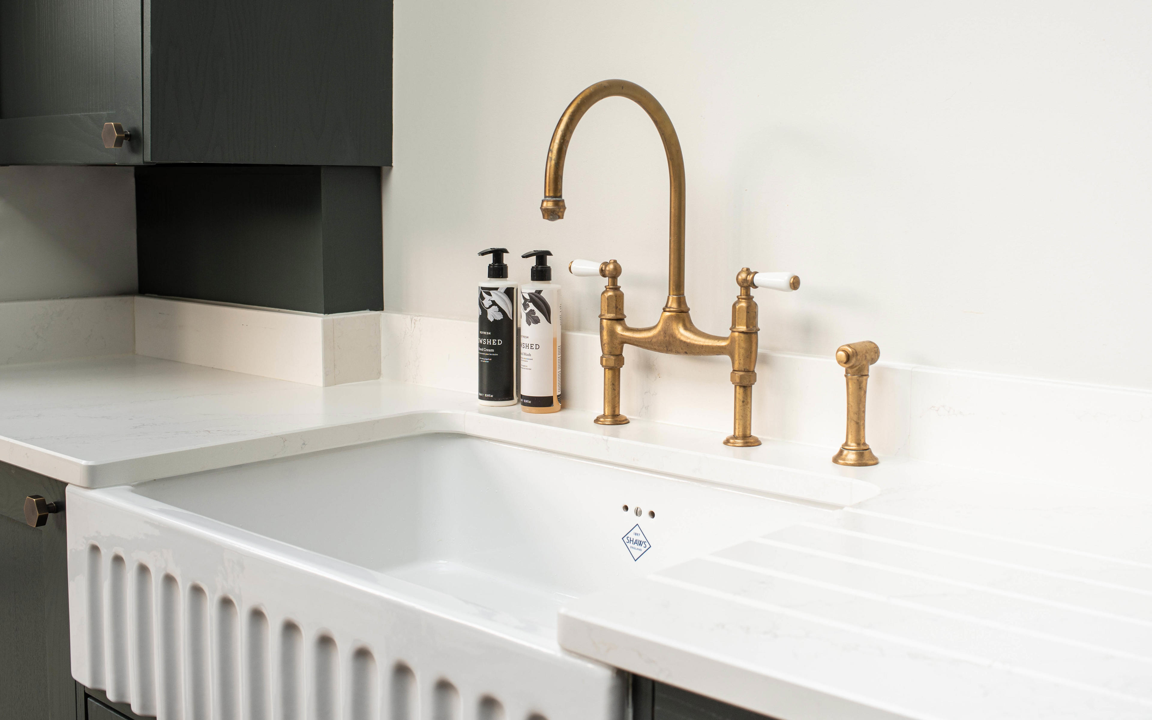 Il lavello Bowland 800 con fronte scanalato è posizionato il più a sinistra possibile sul piano di lavoro, insieme al miscelatore a ponte Perrin & Rowe Ionian con risciacquo a spruzzo laterale, un'altra delle richieste di Penny. Il rubinetto e il risciacquo sono in ottone satinato, in perfetta sintonia con il mobile verde scuro della cucina. Penny voleva avere un piano di lavoro il più lungo possibile e non voleva che fosse interrotto da un lavello al centro. Il lavello secondario è uno Shaws Round, uno dei lavelli più piccoli di Shaws, perfetto come seconda opzione. In questo caso, era ideale da abbinare a un rubinetto per l'acqua calda istantanea.