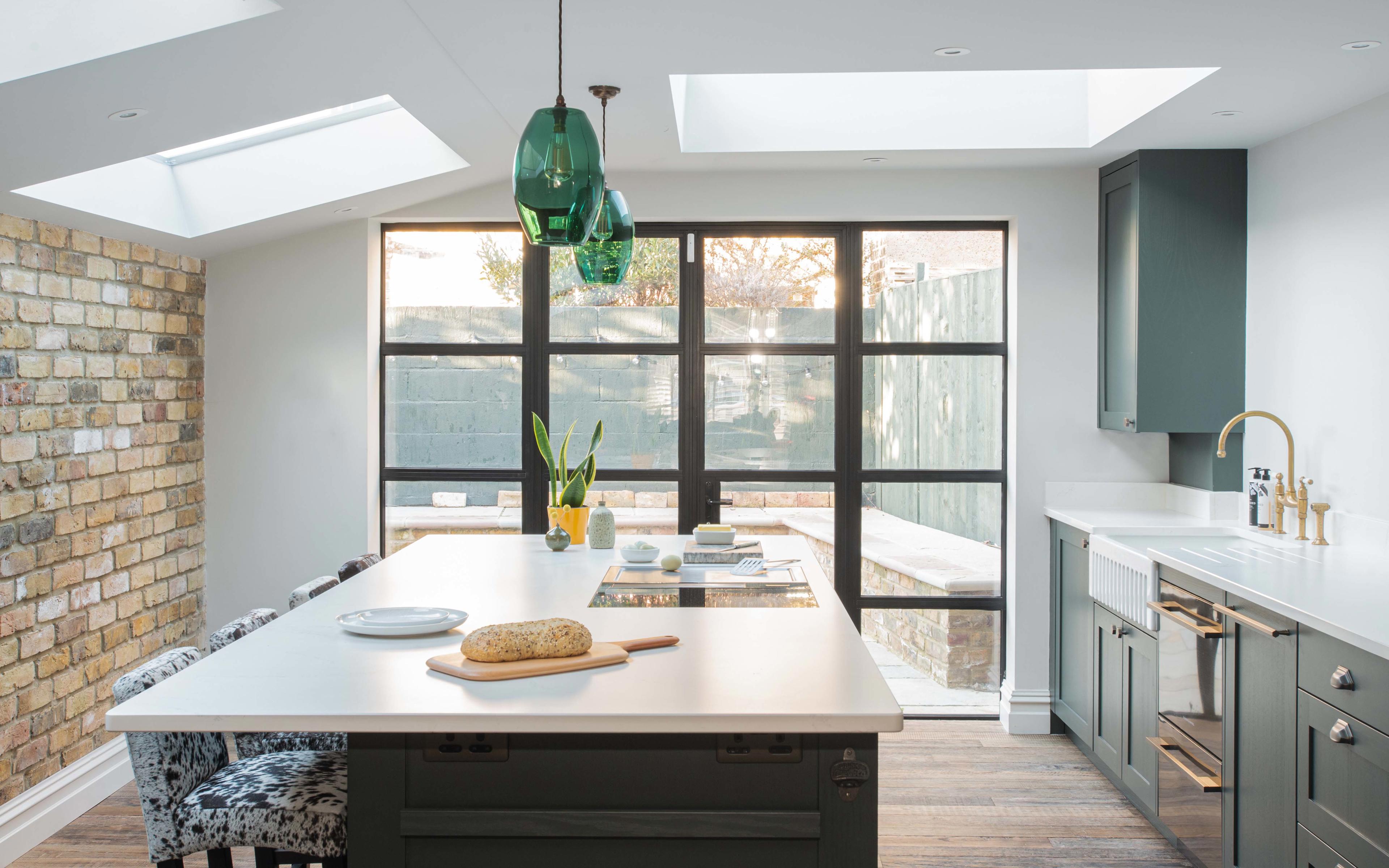 Penny ha chiesto alla London Kitchen Company di aiutarla a creare qualcosa di abbastanza tradizionale ma semplice. Dopo un'approfondita conversazione con il team, ha optato per una classica cucina Shaker di colore verde scuro, con accessori in ottone e piani di lavoro in marmo.